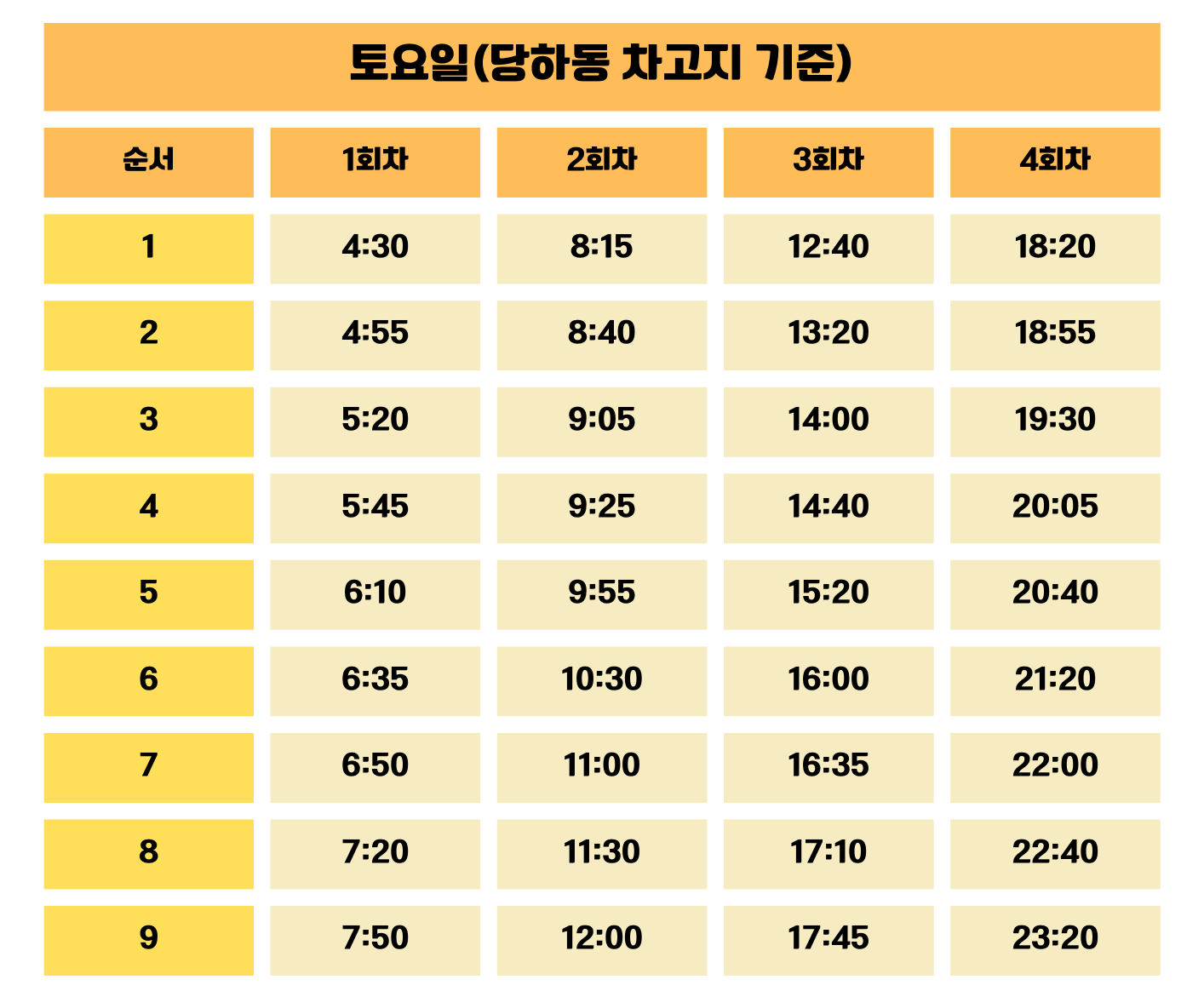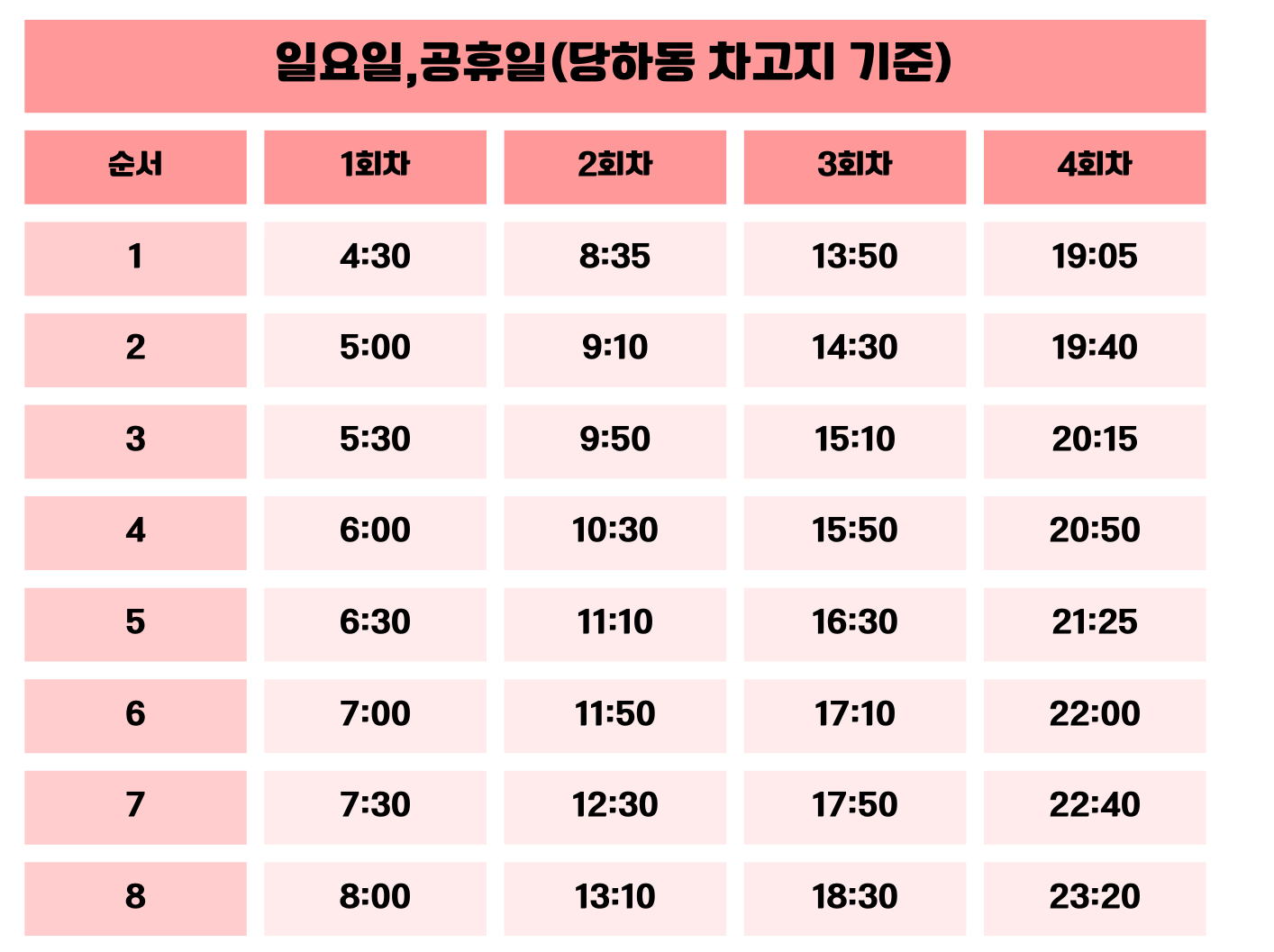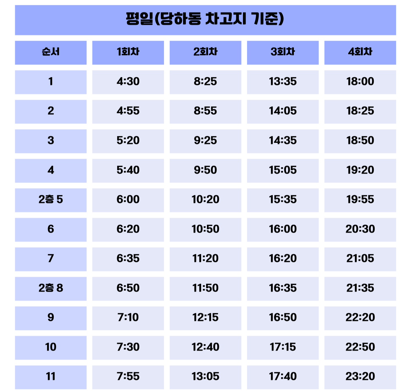 출퇴근 시간대 배차 간격이 조정되었으니, 아래 시간표를 꼭 확인해주세요.